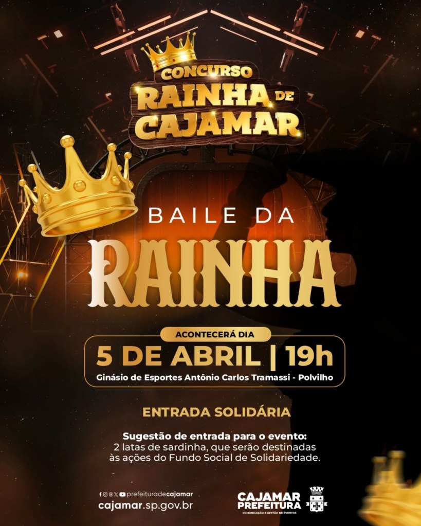 A cidade já está em contagem regressiva para uma das noites mais glamorosas do ano! No dia 5 de abril, a partir das 19h, acontecerá o grande Baile da Rainha de Cajamar 2025. O evento está sendo preparado pela Secretaria de Comunicação e Gestão de Eventos e será realizado no Ginásio de Esportes Antônio Carlos Tramassi, no Polvilho.