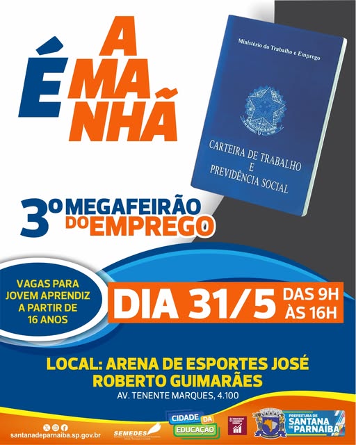 Está chegando o momento mais esperado por quem busca uma colocação no mercado de trabalho! Nesta sexta-feira, dia 31 de maio, acontece o 3º Megafeirão do Emprego de Santana de Parnaíba, das 9h às 16h, na Arena de Esportes José Roberto Guimarães (Av. Tenente Marques, 4.100).