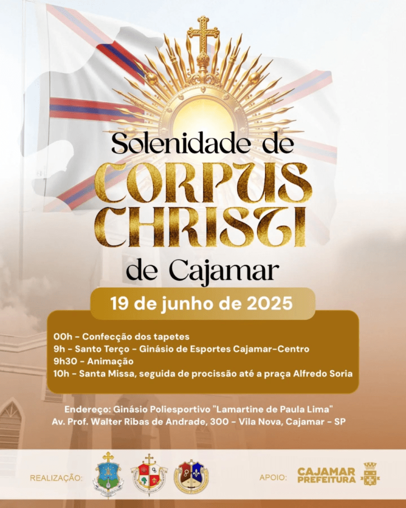No próximo dia 19 de junho, feriado nacional de Corpus Christi, Cajamar viverá um momento especial de fé e união. Todas as paróquias do município estarão reunidas no Centro para celebrar uma das datas mais significativas do calendário católico.