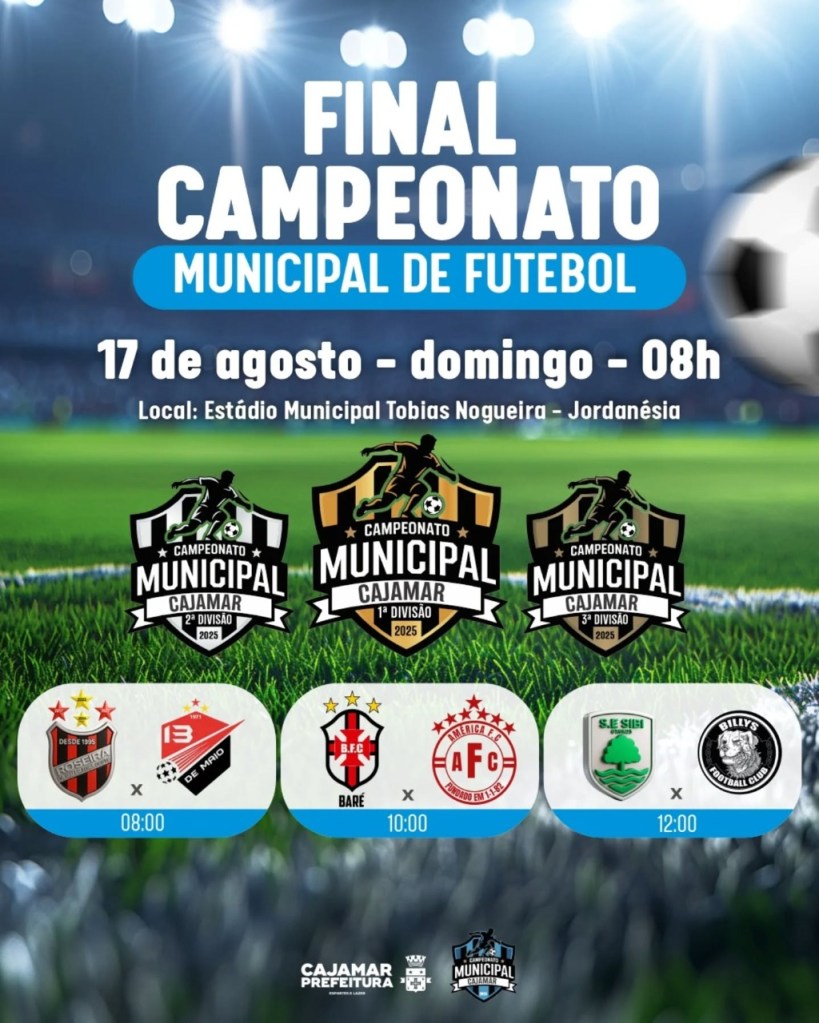 A cidade de Cajamar será palco de muita emoção e rivalidade neste domingo (17), com a realização das finais das 1ª, 2ª e 3ª divisões do Campeonato Municipal de Futebol. Os jogos serão no Estádio Municipal Tobias Nogueira, em Jordanésia, a partir das 8h, com entrada gratuita para toda a população.