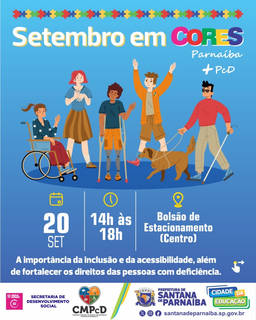 Em comemoração ao Dia Nacional de Luta da Pessoa com Deficiência, que será celebrado em 21 de setembro, a Prefeitura de Santana de Parnaíba realizará, no sábado (20/9), o evento Setembro em Cores: Parnaíba + PCD, às 14h, no Bolsão de Estacionamento. A atividade tem como objetivo reforçar a luta pela inclusão, acessibilidade e fortalecimento dos direitos das pessoas com deficiência (PCDs).