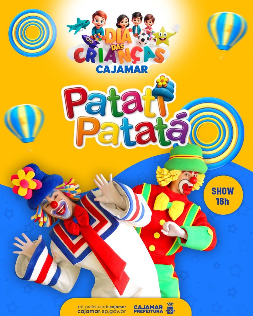 O Dia das Crianças promete ser inesquecível em Cajamar! Neste domingo, 12 de outubro, a partir das 10h, o Centro de Eventos Boiódromo, em Jordanésia, será palco de uma grande celebração preparada pela Prefeitura de Cajamar, reunindo atrações para todas as idades e encerrando com o incrível show de Patati & Patatá.