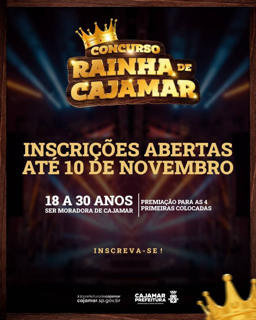 As interessadas podem se inscrever de forma gratuita através do site rainha.cajamar.sp.gov.br. O concurso é voltado a mulheres moradoras de Cajamar, com idade entre 18 e 30 anos durante o período de inscrições.