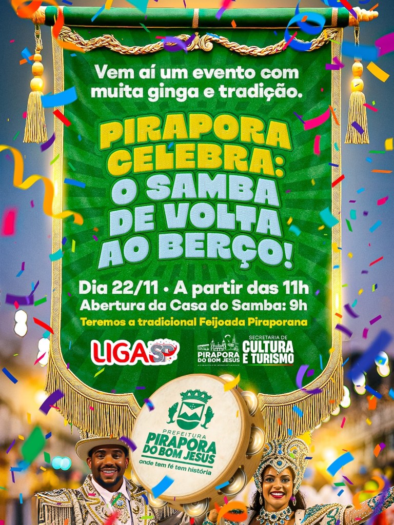 Pirapora do Bom Jesus se prepara para viver um dos eventos mais emocionantes de seu calendário cultural. Neste sábado (22), a cidade receberá a nata do samba paulista para o festival “Pirapora Celebra: O Samba de Volta ao Berço!”, uma grande homenagem ao território considerado por muitos como o Berço Sagrado do Samba — celebração que antecede o Dia Nacional do Samba, comemorado em 2 de dezembro.