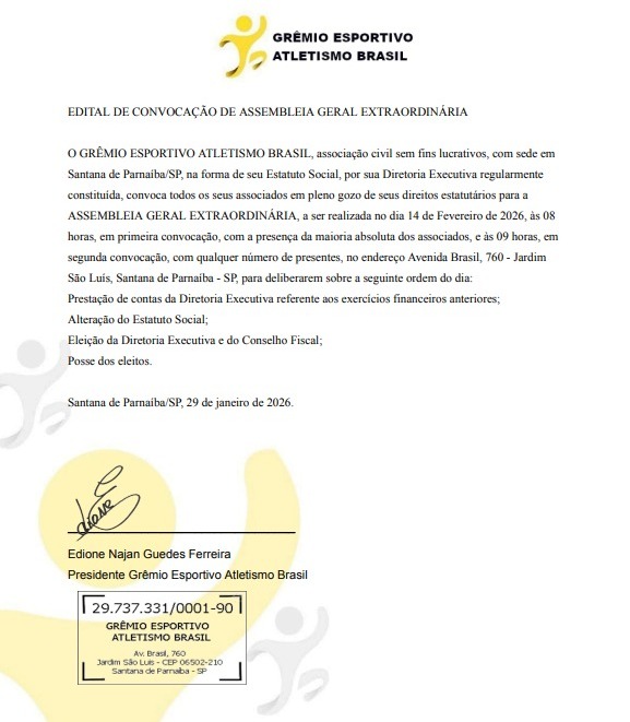 O Grêmio Esportivo Atletismo Brasil, tradicional associação de Santana de Parnaíba, convoca oficialmente todos os seus associados para um momento crucial de sua gestão. No próximo dia 14 de fevereiro (sábado), será realizada uma Assembleia Geral Extraordinária para deliberar sobre os rumos administrativos e a liderança da entidade.