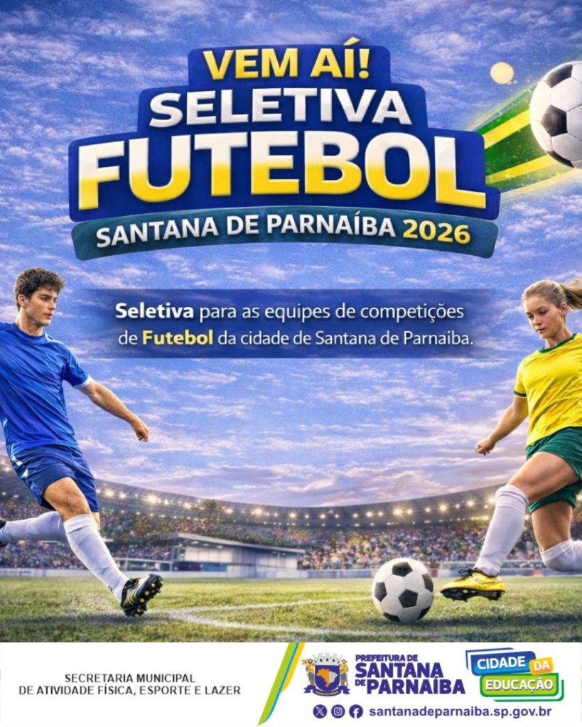A Prefeitura de Santana de Parnaíba anunciou a realização das seletivas de futebol para a temporada 2026. A iniciativa vai formar as equipes que representarão o município nas principais competições do calendário esportivo ao longo do ano.