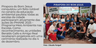 Pirapora do Bom Jesus se destaca no PMANE 2025 e tem 100% das escolas premiadas por ações ambientais