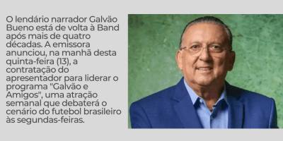 Sem categoria Galvão Bueno retorna à Band após 44 anos e comandará programa esportivo 13 de fevereiro de 2025 — 0 Comentários