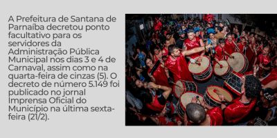 Sem categoria Prefeitura de Santana de Parnaíba decreta ponto facultativo durante o período de Carnaval 25 de fevereiro de 2025 — 0 Comentários