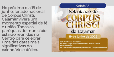 Sem categoria Cajamar se une para celebrar o Corpus Christi com fé e tradição 18 de junho de 2025 — 0 Comentários