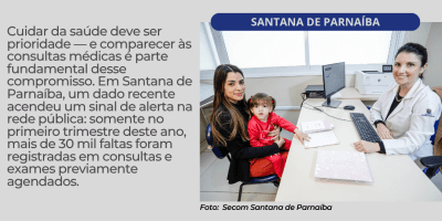 Sem categoria 30 mil faltas em consultas médicas acendem alerta na saúde pública de Santana de Parnaíba 29 de abril de 2026 — 0 Comentários