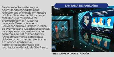 Santana de Parnaíba conquista 1º lugar estadual em Desenvolvimento Socioeconômico e Ordem Pública no Prêmio Band Cidades Excelentes
