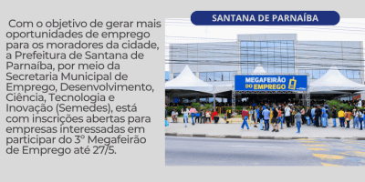 Sem categoria Prefeitura de Santana de Parnaíba abre inscrições para empresas participarem do 3º Megafeirão do Emprego 13 de maio de 2025 — 0 Comentários