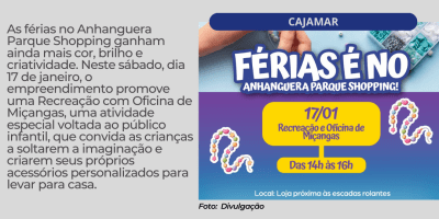 Sem categoria Anhanguera Parque Shopping promove Oficina de Miçangas e transforma as férias em criatividade e diversão 15 de janeiro de 2026 — 0 Comentários