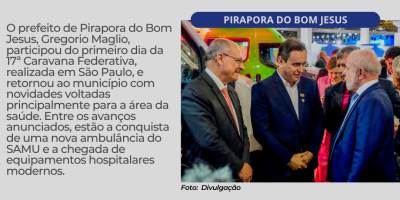 Sem categoria Prefeito de Pirapora do Bom Jesus participa da 17ª Caravana Federativa e garante novos investimentos para a saúde 20 de março de 2026 — 0 Comentários